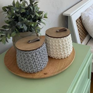 Boho crochet bathroom storage basket, multi purpose bathroom basket, bathroom accessories, cotton pads jar, qtip holder, lidded basket