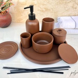 Brown Bathroom Set, 7 Piece Concrete Bath Accessories, Soap Dispenser Bottle, Toothbrush Holder, Round Tray, Cotton Jar, Scent Diffuser