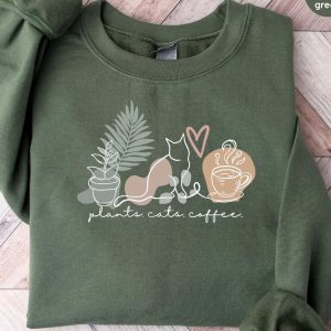 Cat Plant and Coffee Sweatshirt, Cat Owner Gift Longsleeve, Gift for Plant Love Hoodie, Plant Love Gift, Coffee Love Sweater, Cat Mom Hoodie